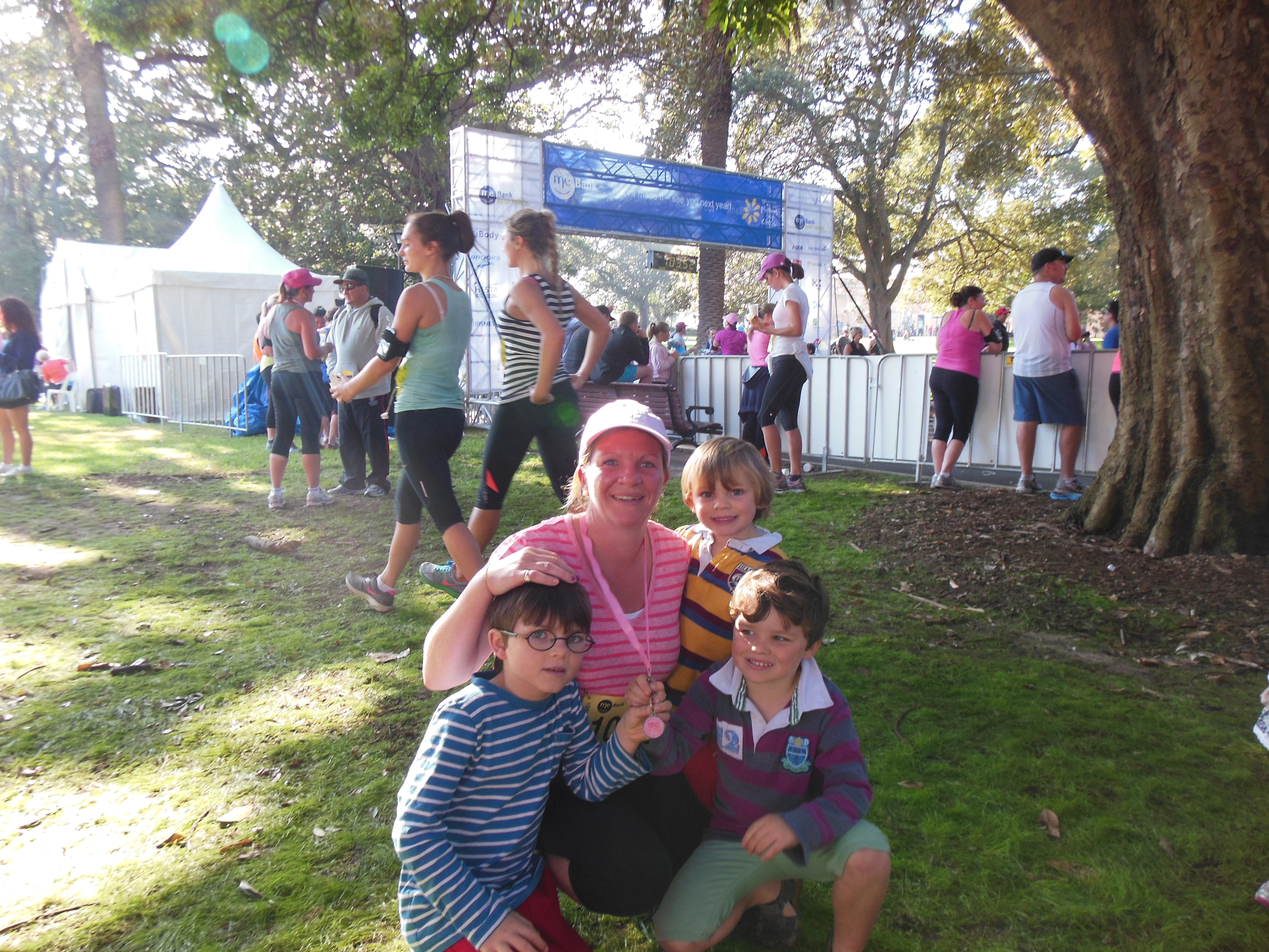 Someone had been clever with their marshalling choice for the 7km mark.  Encouraging words, spoken from the heart from someone who could have been your Mum, or your sister or your friend.  The end was in sight, my boys were waiting and I went for it.  So what if hurt, I would heal.  I crossed the line one minute and fifty-nine seconds to spare.  I laughed and cried in exhilaration.  I hugged my family and held them close.  What a rush, what an honour and privilege it was to be part of something that hopeful, that determined.  The best bit?  Hearing the pride (tinged with incredulity) in their voices as my sons said ‘You did it Mum.’