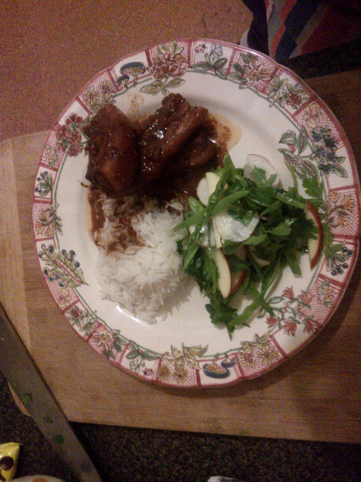 Pork rashers are thick slices of pork belly so of course are not exactly a diet food…but they are great cooked slowly for a long time until they are falling apart . I chucked this recipe together out of things I had in the cupboard. It is tangy but rich and comforting. We had it with rice and a salad of apple, spring onion, snow pea (manage tout), mint and coriander. Perfect Friday night food.